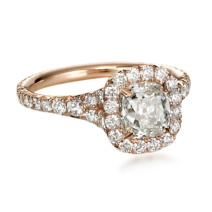 Rose Gold French Cut Pave Diamond Halo surrounded a Cushion Cut Diamond by Giraux Fine Jewelry